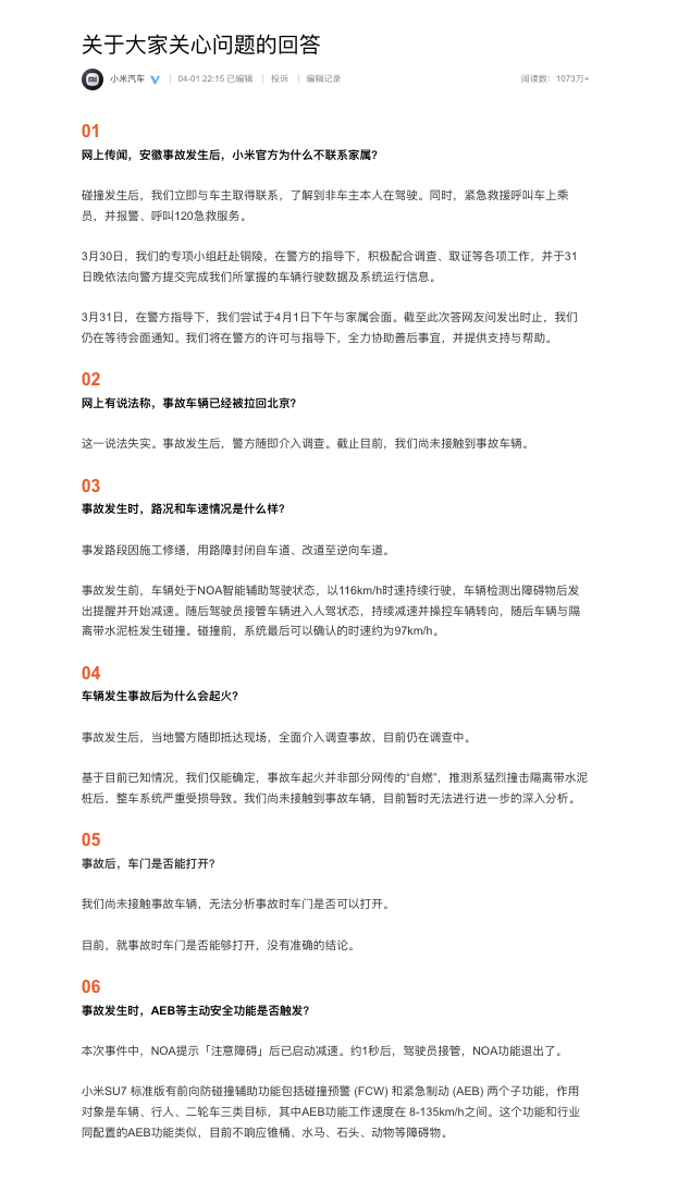 4月1日22:15,小米汽车官方微博账号发布长文《关于大家关心问题的回答》,对公众关心的问题进行了回应: