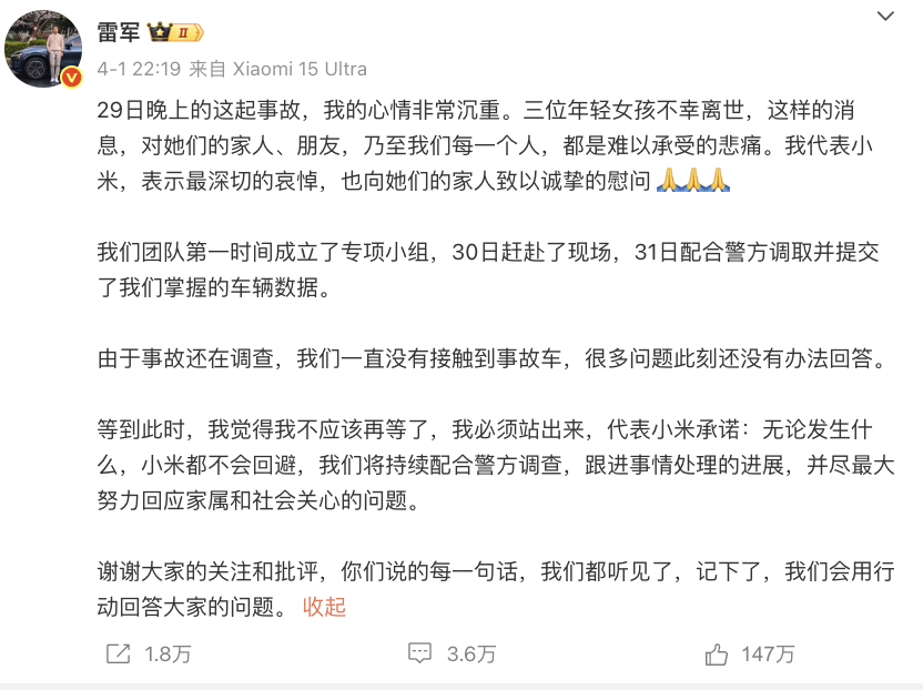 先是通过小米集团发言人的官方账号而不是小米汽车的账号发布声明,传递了事件已引起母公司层面的高度重视;针对第一次声明引发的争议,再通过小米汽车发布长文做进一步的说明,再由公司“灵魂人物”雷军来表达:“无论发生什么,小米都不会回避,我们将持续配合警方调查,跟进事情处理的进展,并尽最大努力回应家属和社会关心的问题。”