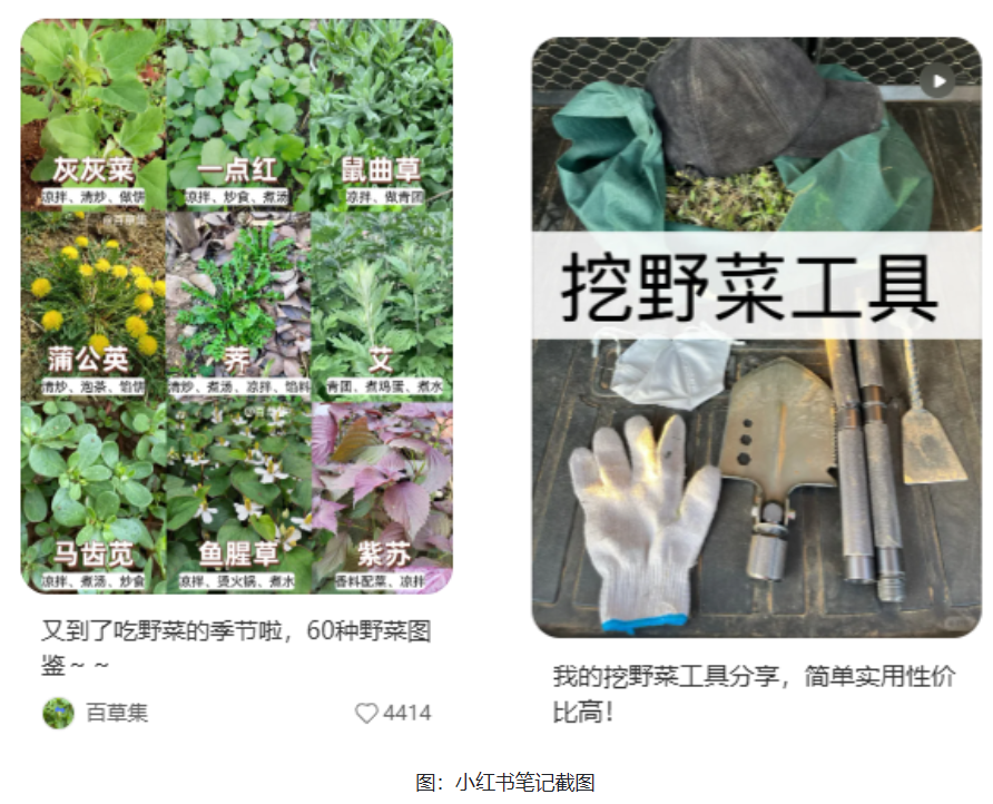 小红书上,“野菜图鉴、挖野菜神器”等笔记成为热门内容,爆文笔记频出,用户晒出“战利品”野菜的市场价格,将免费劳动转化为“省钱美学”的具象符号,用泥土的收获完成了一场对消费主义的温和抵抗,以“看得见的获得感”重构价值认同。