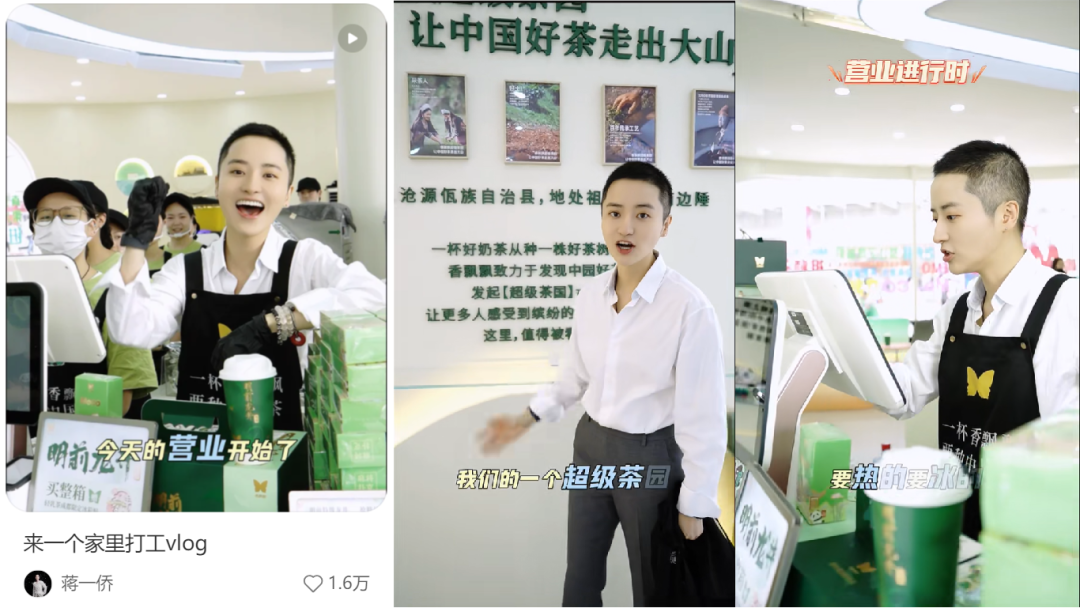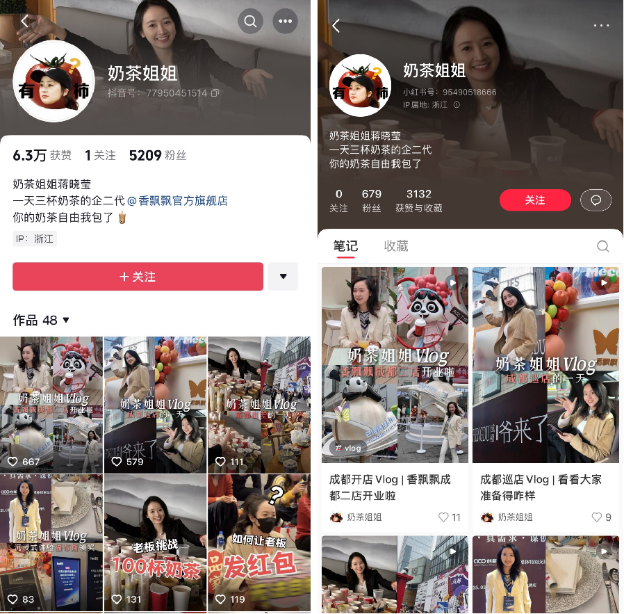 除了不凡的商业头脑和经营能力,蒋晓莹也在抖音、小红书等平台开设“奶茶姐姐”账号,展现工作日常,打造个人IP。