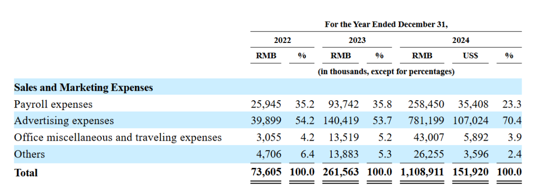 招股当然,我们所提及到的“营销费”,实际是“销售及市场开支”,这个类目除了广告营销费,还包含了市场部员工成本和促销开支。