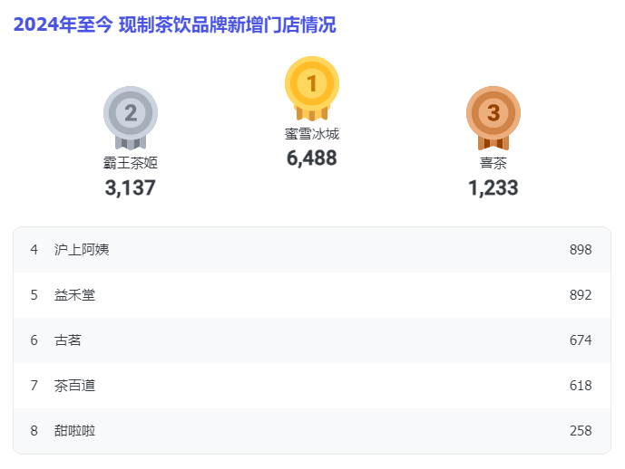 截止2024年底,星巴克在中国大陆门店有7685家,而霸王茶姬有6440家,2023年1月时,这个数字还只是1000,两年时间,门店数量上霸王茶姬就已经超过了星巴克。