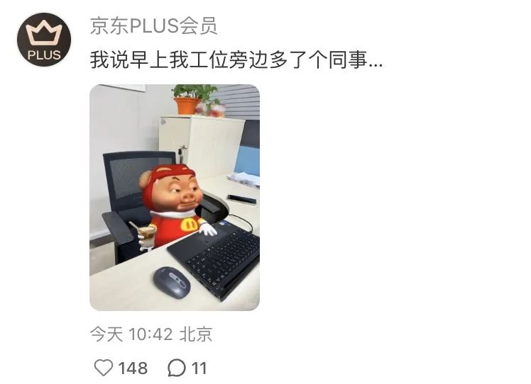 笑鼠,京东plus会员表示一大早就看到工位旁边多了个同事。