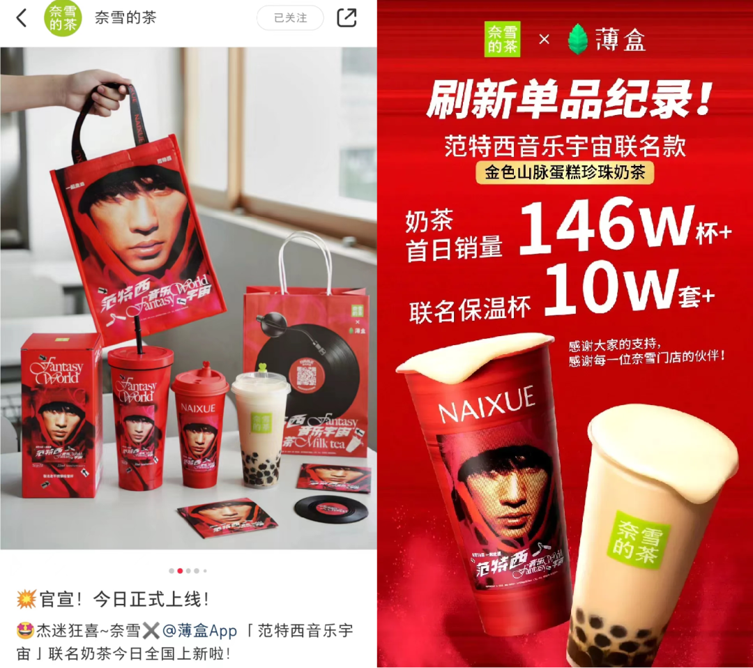 早在23年,奈雪的茶推出和薄盒APP「范特西音乐宇宙」的联名奶茶,以单品首日销量146万杯+,联名保温杯10W套+的战绩,刷新当时的奈雪单品记录。
