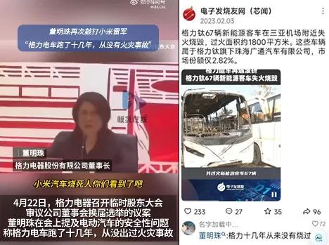 经常因为一些关于雷军和小米的发言,被指格局不够。内部会议里直接拿“小米汽车事故”说事,又扒出格力汽车火灾打脸。
