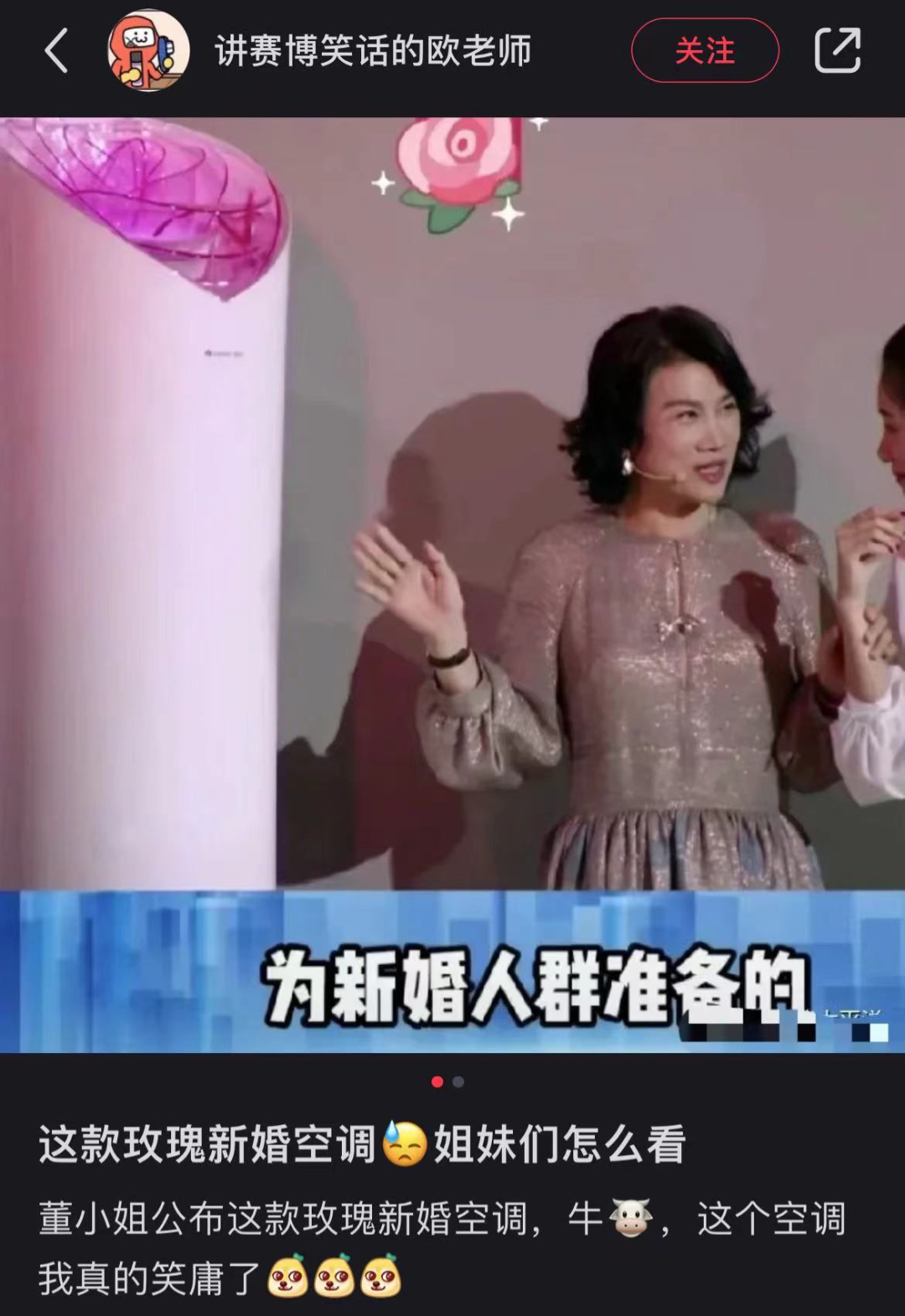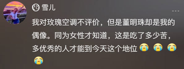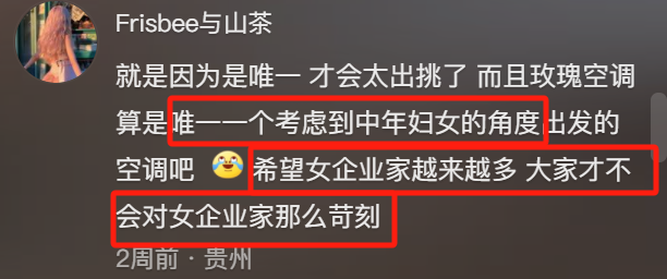 以“为玫瑰空调审美平反”为切口,举起“身处高位的女性企业家”的身份大旗,释放个人的正面舆论效应。