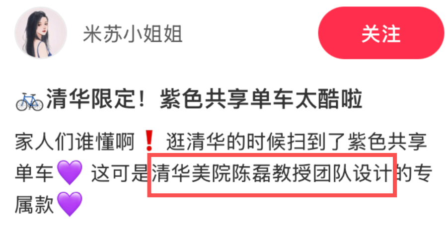 一方面,限定校内骑行、仅在校庆期间投放等前提,赋予了产品稀缺性与专属感,为激发用户自传播意愿做好了铺垫;另一方面,小紫车的高颜值,以及相关清华校园梗也为后续裂变传播埋下了伏笔。