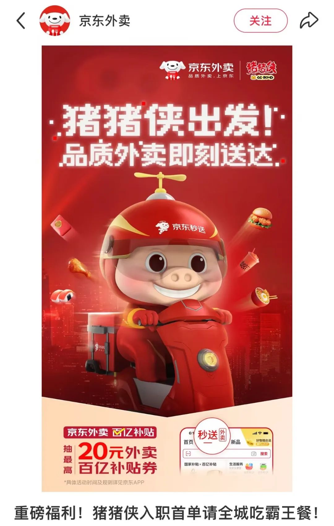 结果京东外卖市场部也是真听劝,没过几天就正式官宣猪猪侠入职,岗位还是京东外卖骑手。