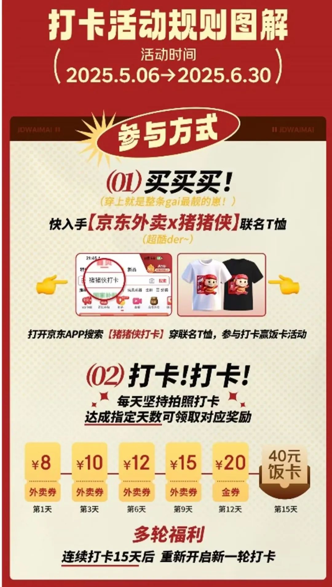 穿上T恤连续拍照打卡15天可以获得40元外卖饭卡,每15天为一轮,可以连续参与多轮。