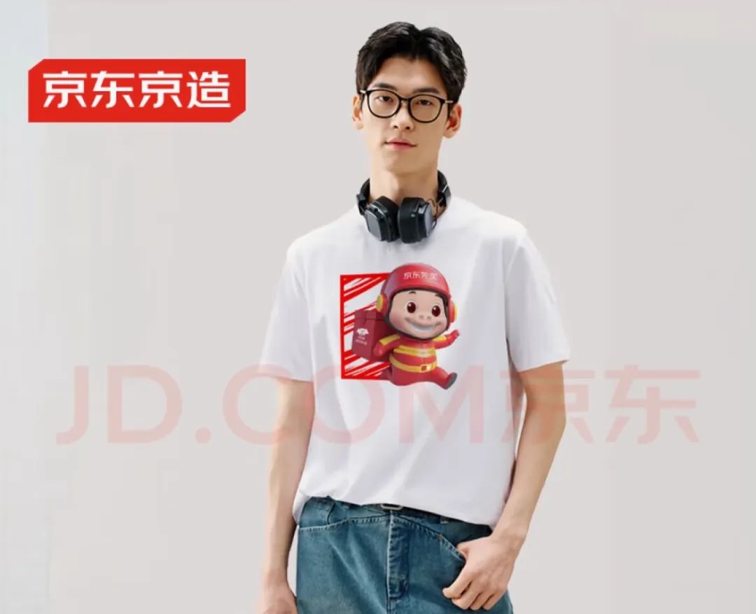 再比如,京东外卖最近推出了一款和猪猪侠联名的T恤,有一种金牌员工登上公司荣誉墙的感觉。