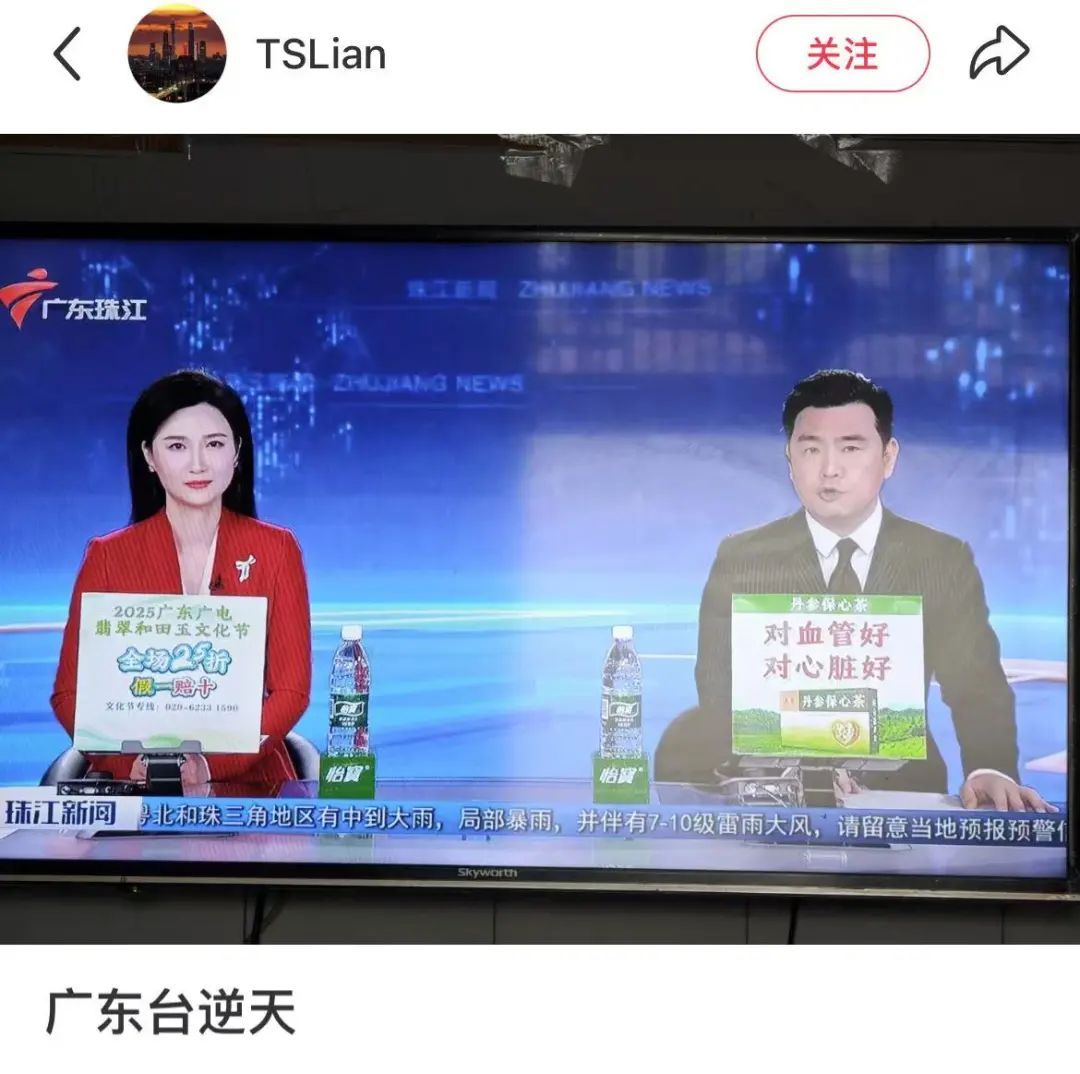 按照其他网友的图片分享,这次的三个广告位也不是什么稀奇的事儿了,而是广东珠江新闻电视的基本操作了。