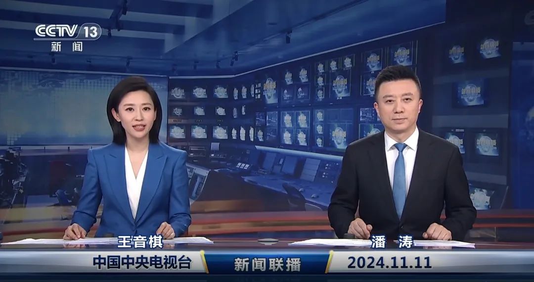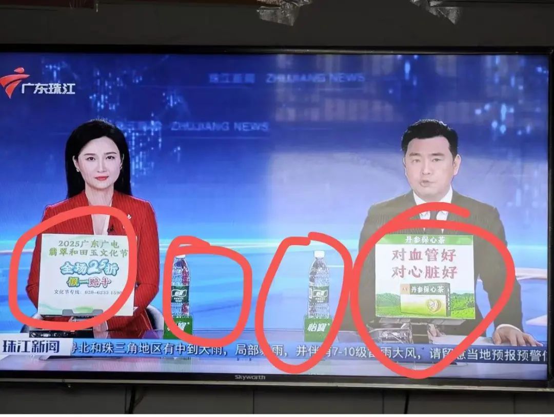 两位新闻主持人身穿西装革履,头发梳得一丝不苟,然而在他俩前面还摆着两块广告牌: