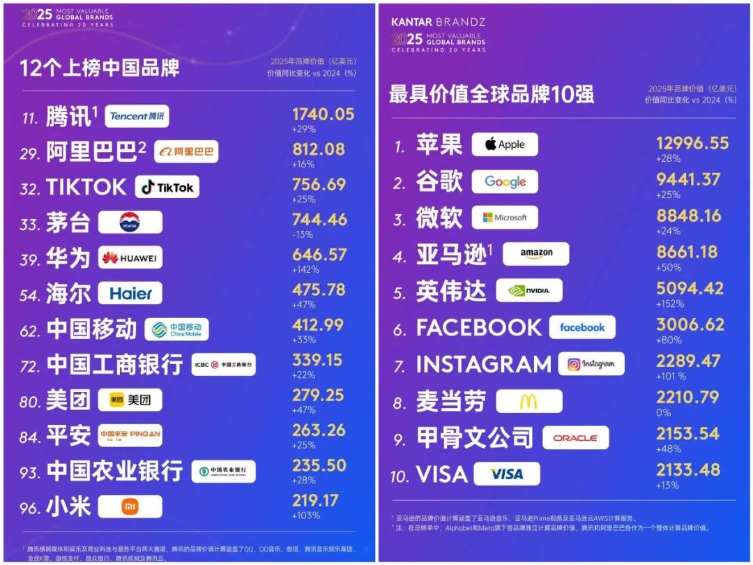 不久前,《2025 凯度 BrandZ 最具价值全球品牌 100 强》榜单发布,中国品牌以 12 席的阵容展现出强劲的全球竞争力。这份承载着数字经济浪潮与消费变革的榜单,不仅勾勒出中国品牌在科技驱动下的价值跃升轨迹,更揭示了其通过生态重构、文化赋能与全球化布局改写商业规则的深层逻辑。
