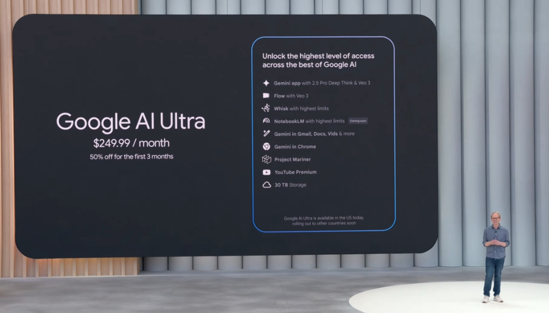 全新打造的谷歌AI Ultra定价249.99美元/月,不仅拥有全套AI技能包,同时还包含YouTube Premium、30TB云存储,以及早期访问Agent Mode——用户只需陈述目标,Gemini就会智能协调调用工具以实现。