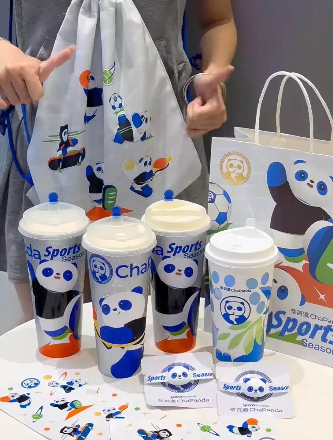 去年巴黎奥运会期间,茶百道还以“茶茶运动季”为主题,推出了手环、贴纸和抽绳包等周边,其中大部分周边及包材上都能够看到参与不同体育项目的蓝色熊猫形象。