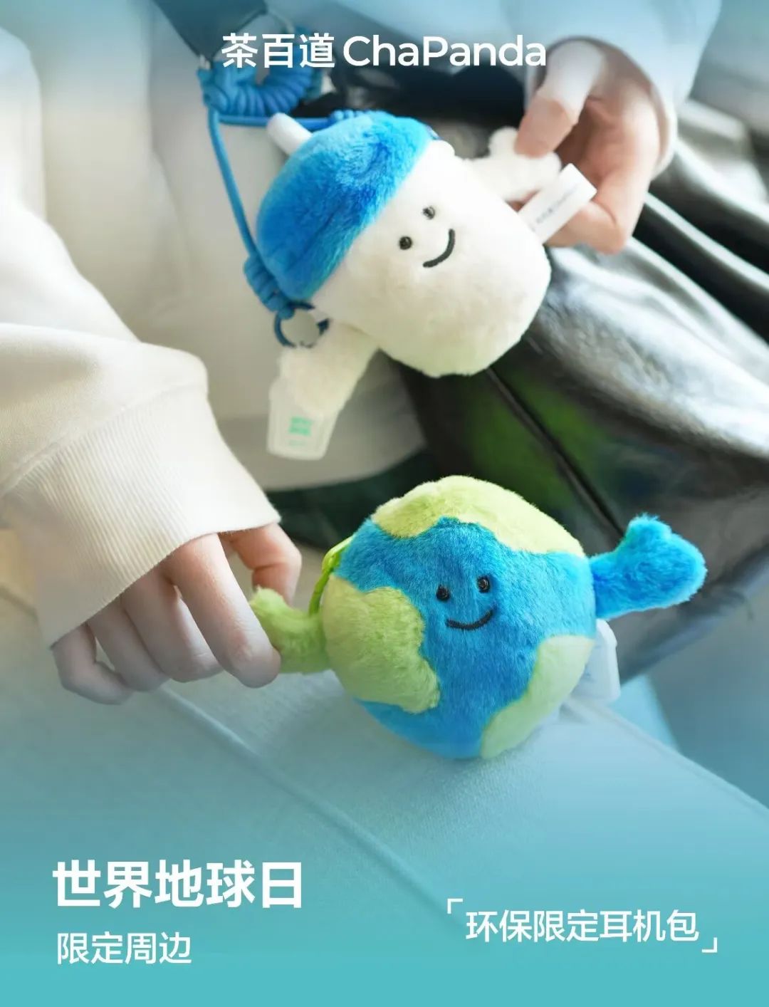 像茶百道此前就在4月22日的世界地球日,推出过地球形象的限定毛绒耳机包