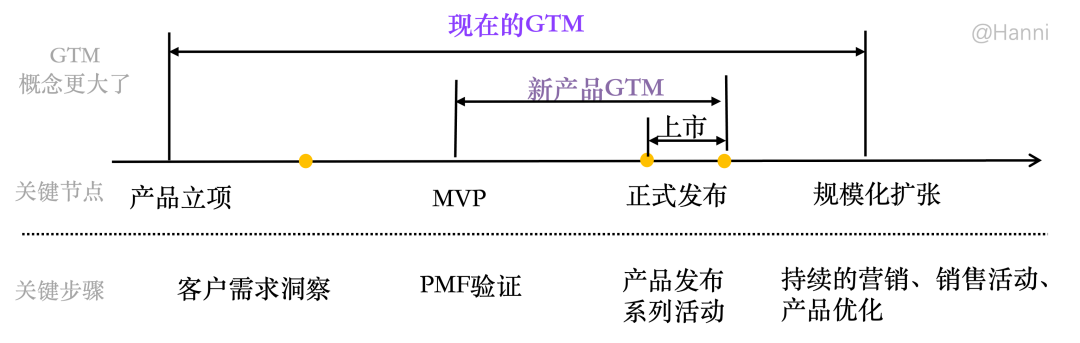 随着产品驱动型PLG商业模式(多用于B2B SaaS、AI大模型及agent、智能硬件等)的迅猛发展,Go-to-Market的定义已经从市场分析就开始,并延展到大规模扩张初期。我简单画了示意图如下。