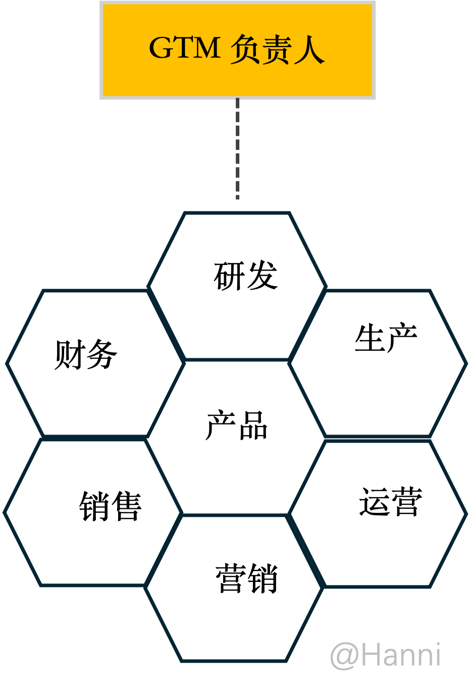 传统的跨部门合作从上至下沟通模式。比如GTM负责人需要和产品部门负责人沟通,由负责人再和团队相关人员沟通。