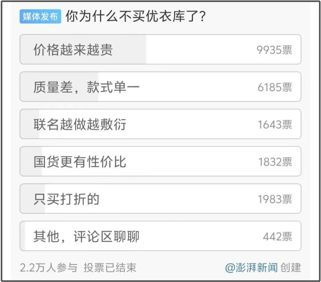 在2.2万人参与的“不买优衣库的理由”投票中,其中“价格越来越贵”成为压倒性的第一,而排名第二的原因则是“质量差、款式单一”。