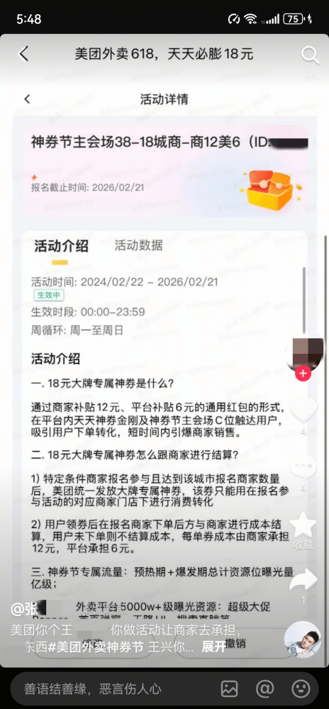 一位名为@小北餐饮课堂 的抖音用户发布视频透露,美团天天神券活动的城商18元红包,单红包商家基础承担金额竟然是12元,加上配送费和平台扣点,商家每单实际承担的成本高达20元,商家属于亏损经营。视频里,他呼吁:外卖商家不该填坑。