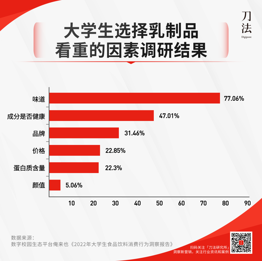据小马了解,相关报告显示,在乳制品消费上,大学生群体有以下特征:1、看重口味>成分健康;2、不看重品牌。