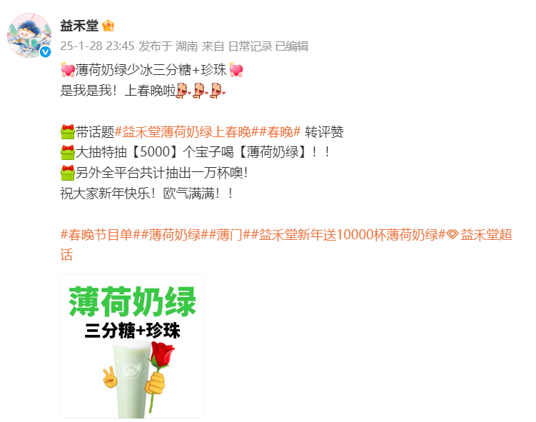 蜜雪冰城、茶百道的茉莉奶绿、今年春晚出圈的益禾堂薄荷奶绿……