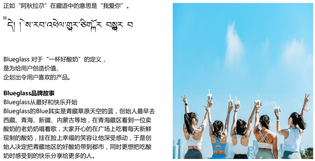 并附赠一个走心品牌故事:在青海藏区看到一位买酸奶的老奶奶唱着歌,大家开心地吃着新鲜现制的酸奶,使得创始人深受感动,决定把青藏地区的好酸奶带到都市……