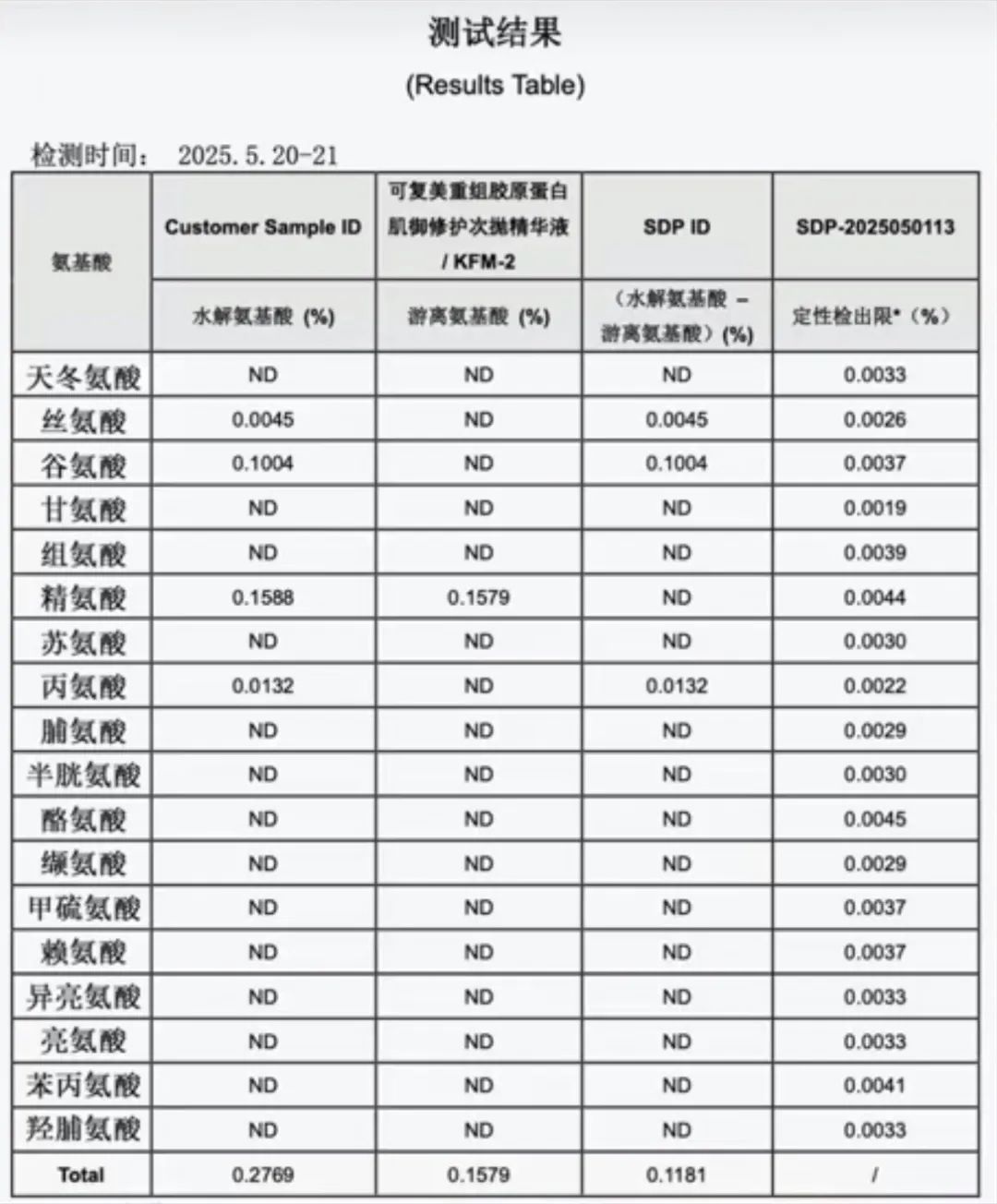 可复美说,自己对相关产品进行检测,而且特意做了“多批次”,检测结果胶原蛋白含量均大于0.1%,意思就是“加了”,而且“量大管饱”。
