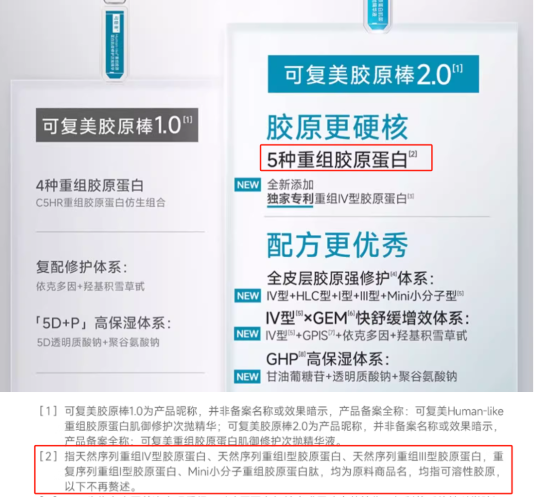 胶原棒升级后,从4种重组胶原蛋白升级到了5种,我们去翻了官方对5种重组胶原蛋白的注释,分别是:天然序列重组IV型、天然序列重组I型胶原蛋白、天然序列重组III型胶原蛋白,重复序列重组I型胶原蛋白、Mini小分子重组胶原蛋白肽。