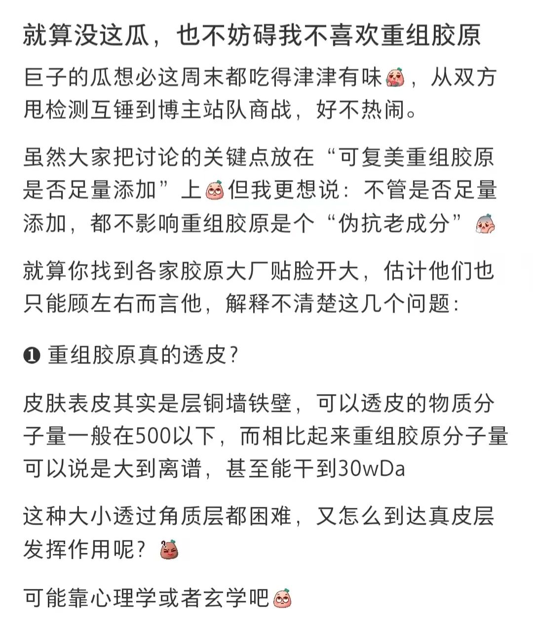 这次,博士换了角度,从吐槽重组胶原蛋白“没用”,改成了我们先不说这个东西有没有用吧,它都“没加”。