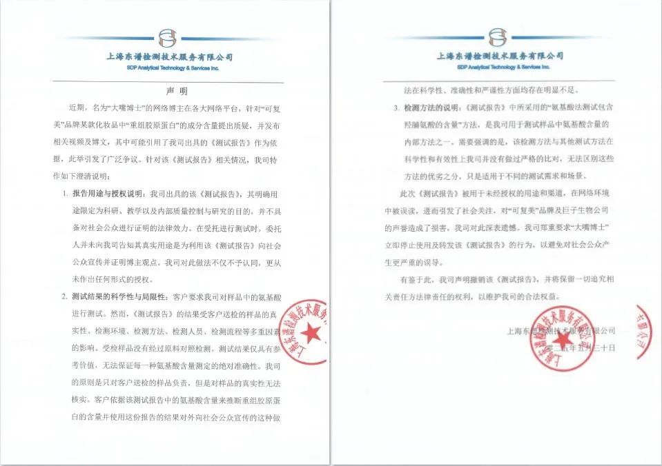 3)对“可复美”品牌及巨子生物公司的声誉造成了损害,东谱检测对此深表遗憾。