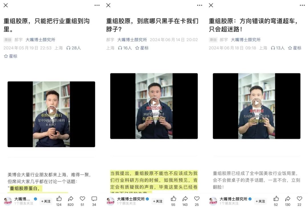 去年5月19号、6月14号、6月18号,大嘴博士发布了3篇内容,连续质疑重组胶原蛋白的作用。
