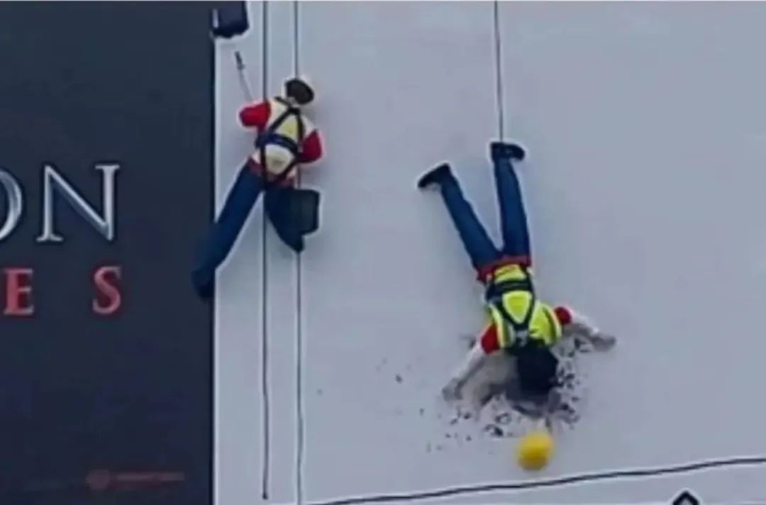 画面中,是两个高空工作者正在施工,而其中一个人,好似是因为失误,导致吊绳失控,人被反转着,砸在了广告牌上。