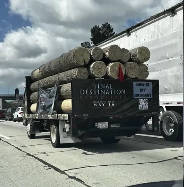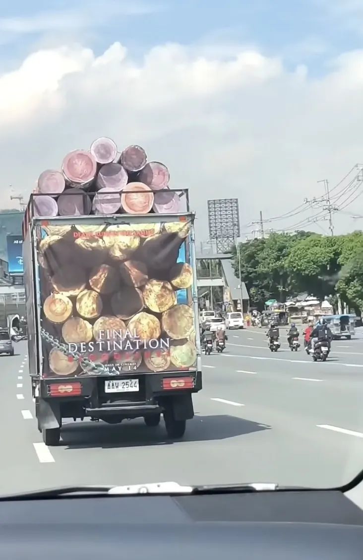 用载着木头的卡车,在公路上致敬了《死神来了2》中因木头脱落造成交通事故的名场面,以及《死神来了6》中,最后木头砸落的画面。