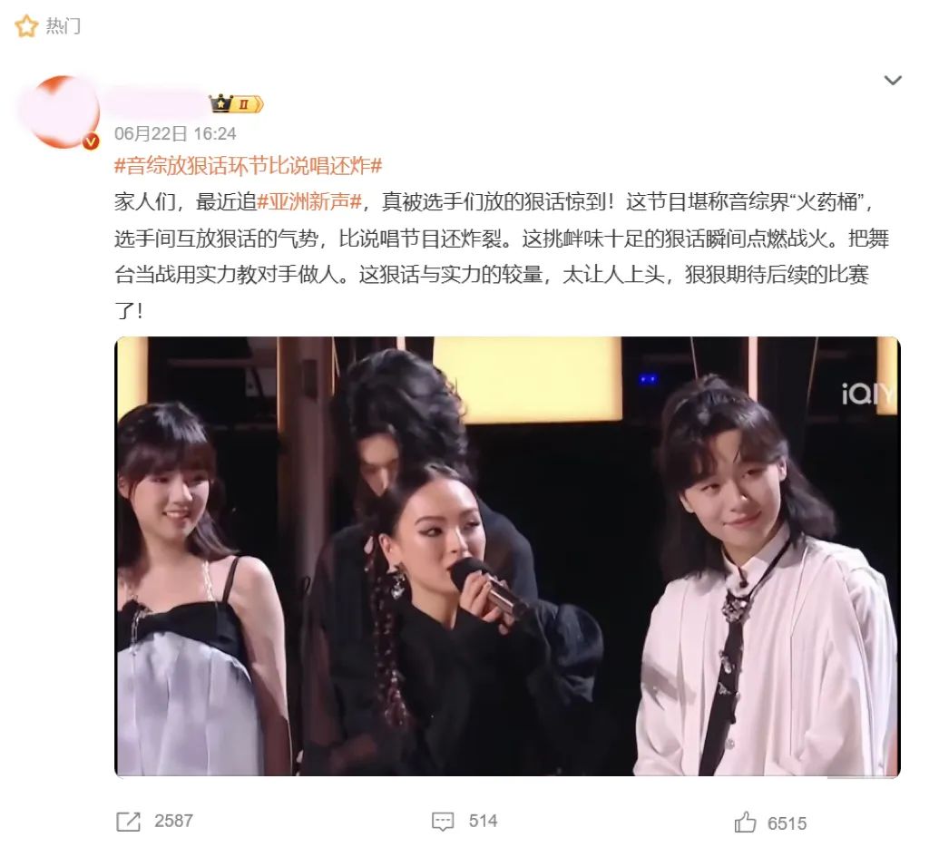 很多年轻人看完《亚洲新声》后表示,被选手间互放狠话的气势惊到,很让人上头,直接把节目推向了高潮。