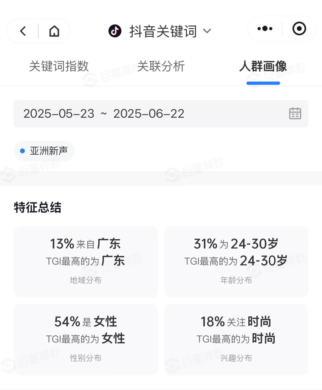 《亚洲新声》自5月23日上线以来,我看了一下它的抖音指数。节目最大的受众群体是24-30岁人群,占比达到31%;TGI最高的是24-30、18-23两个年龄段人群。该TGI指数的意思是,在全网各年龄段人群中,18-30岁人群对这档节目的喜好度最高、观看意愿最强,是节目的高潜力消费人群,而且这群人更加关注时尚、美食、旅行、运动等。