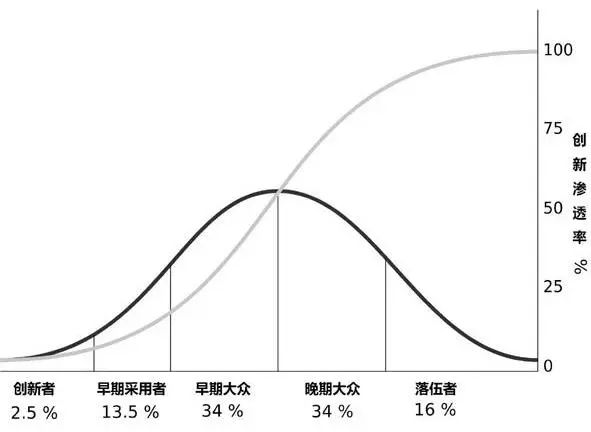 而且,新事物、新技术、新观念的普及都不是一夜之间捕获了大众群体,而是要经历一个从小众圈层兴起逐渐扩散到大众市场的过程,这叫做“创新扩散曲线”。