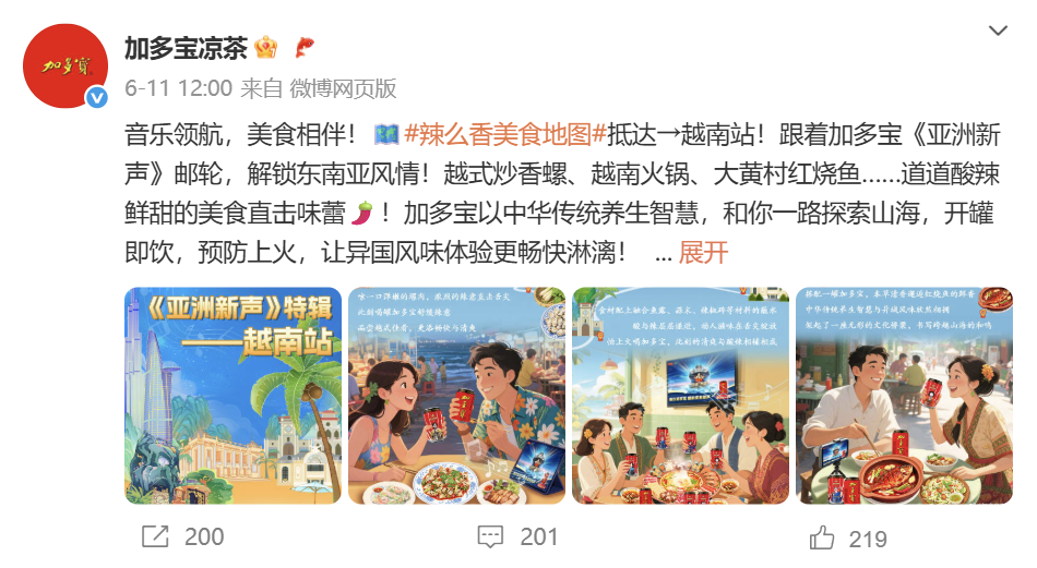 所以加多宝致力打造的美食推广活动,不仅在线上将“辣么香美食地图”与《亚洲新声》中的东南亚风情美食融合,还将在全国十城地标打造热辣美食活动,为用户带来真正的“畅饮加多宝 唱响亚洲新声”体验。