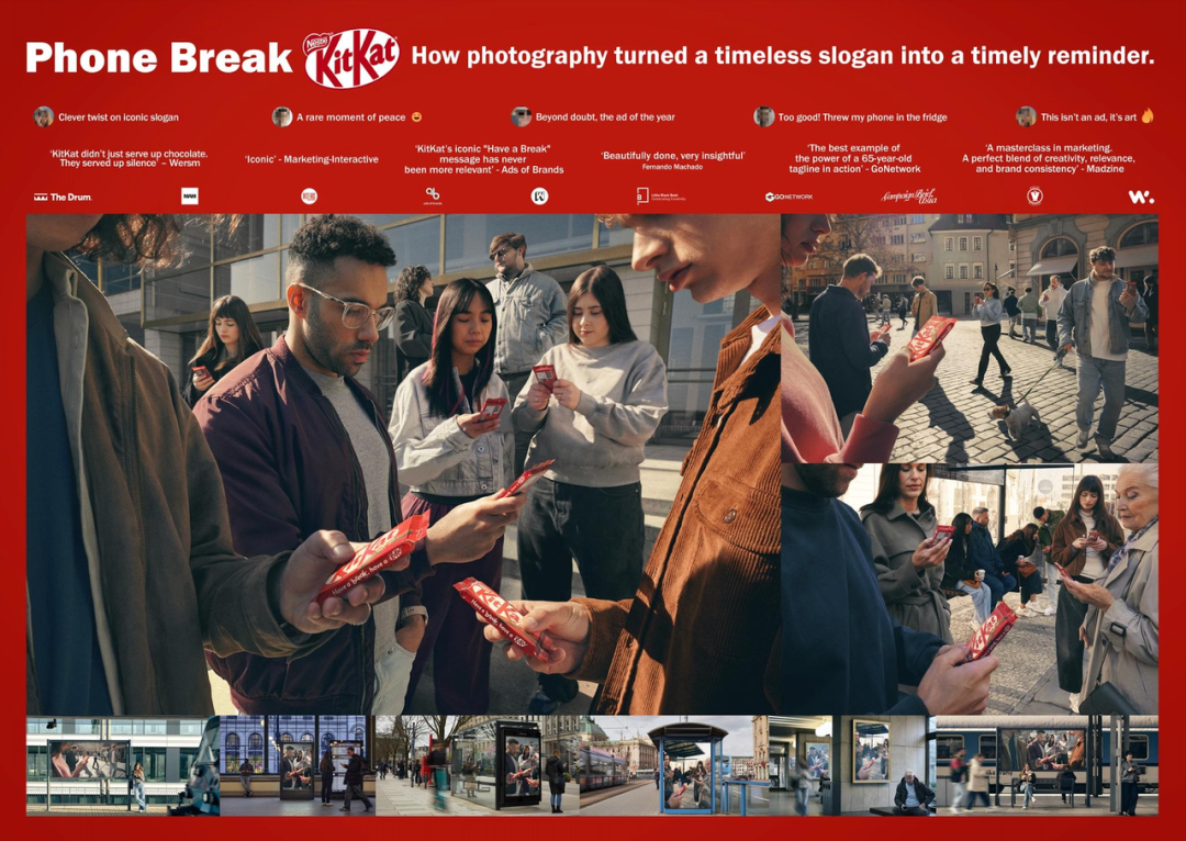 KitKat的获奖案例名称叫《Phone Break》,画面中,原本形形色色的人手中紧握的是手机,但是被替换成了KitKat巧克力,整个场景也从喧嚣变得安静下来。有意思的是,这支广告被KitKat投放在了用户使用手机最频繁的场景中,比如公交站、地铁上、街头巷尾的广告牌等。