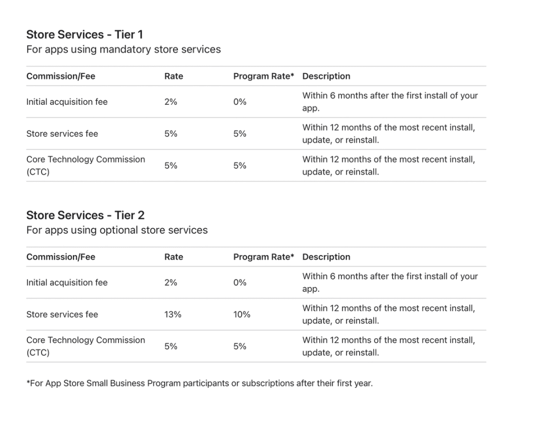 另一种是对于享有苹果二级服务的开发者而言,苹果会征收初始获客费2%、商店服务费13%以及核心技术佣金5%。