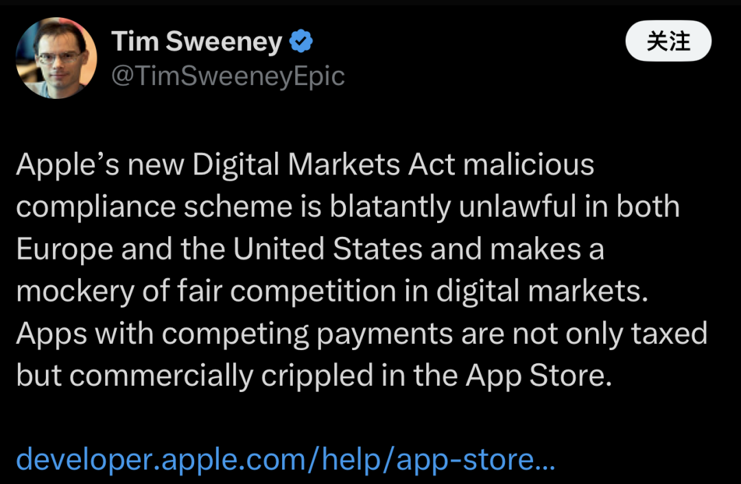 连Epic平台的CEO Tim Sweeney也发文称“苹果针对欧盟出台的支付新政在欧美都明显违法,是对数字市场公平竞争的嘲讽。”