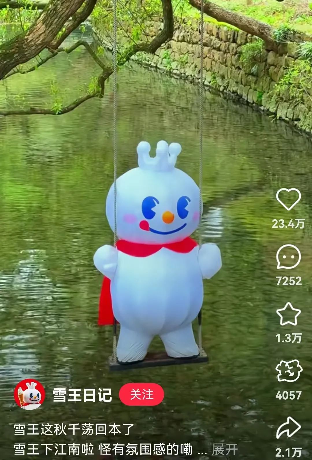 今年3月份,一条“雪王荡秋千”的短视频爆红社交平台。这条看似“偶然”走红的内容,其实只是“雪王下江南”系列的花絮,灵感源自新品“龙井茶”的产地浙江。创意发起到上线仅用不到一周时间,背景音乐和剪辑也临时决定。这种快速反应、边拍边发的轻运营节奏,正是雪王内容策略的常态:“有趣,是第一判断。”