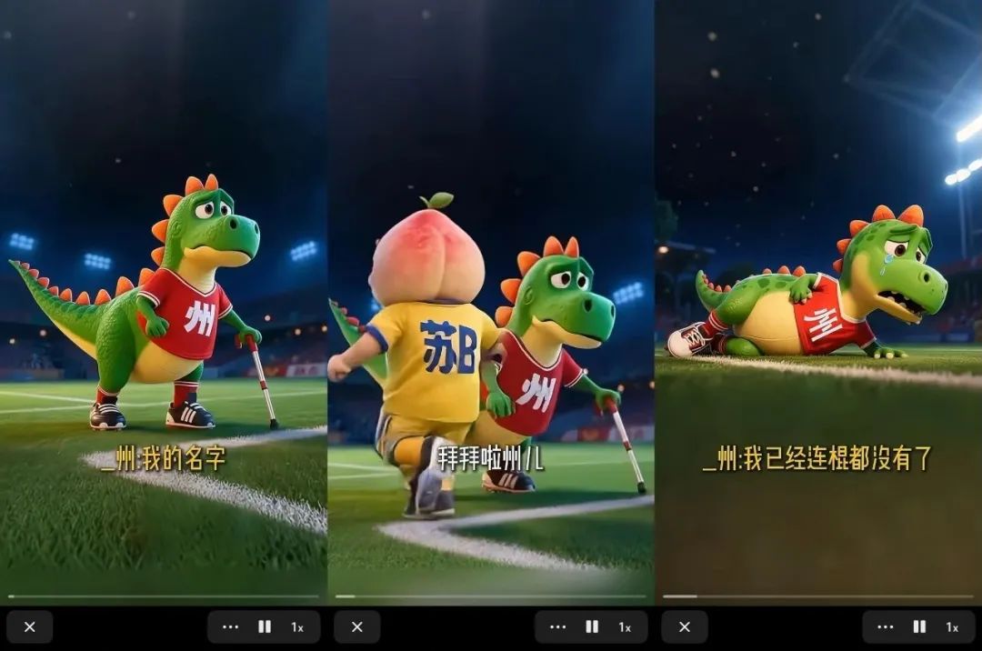 比如开头的恐龙与水蜜桃。常州不敌苏州,输掉了最后一个笔画「|」,只剩下了「州」,这个热梗被江苏卫视官方捕捉,便创作了这个AI短视频。