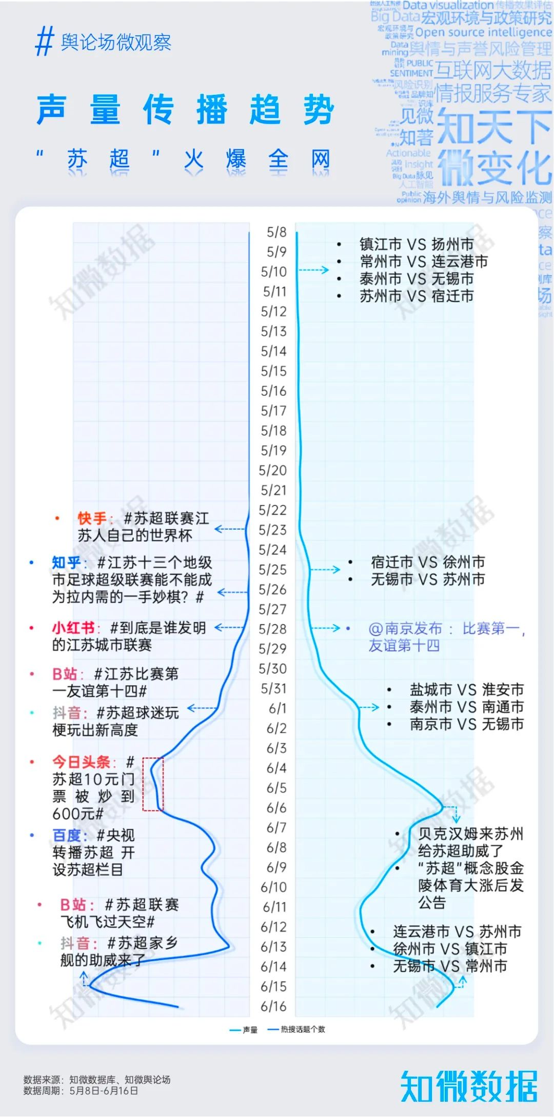 5月10日,苏超战幕拉开;5月28日,「南京发布」官方微信公众号发布文章《「比赛第一,友谊第十四」》,很快文章阅读量突破10万+。官方亲自下场玩梗,苏超热度开始飙升,在6月1日第二轮比赛开始之际达到高峰。随后,苏超相关热梗与话题开始席卷各大自媒体平台。