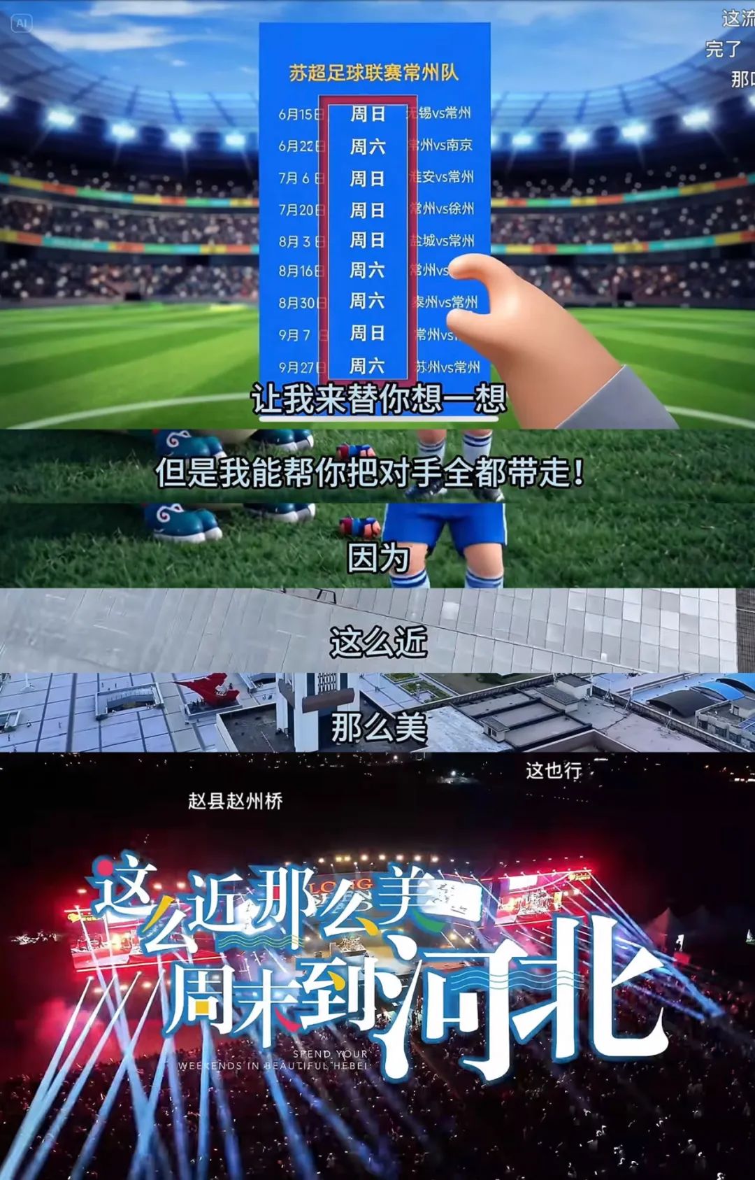 除了@江苏卫视 官方账号,江苏各省的文旅账号,甚至其他省市的文旅相关账号也发布了苏超相关AI短视频——借力「常州把笔画输没了」的热梗,@石家庄文旅投 6月24日发布《0州别哭,我来帮你把对手全部「带走」》,画面里代表着石家庄的小孩说自己虽然没有笔画,但是他发现比赛都在周末。于是他对小恐龙(常州)说——「虽然没有笔画,但是我能帮你把对手全都带走,因为,这么近,那么美,周末到河北。」