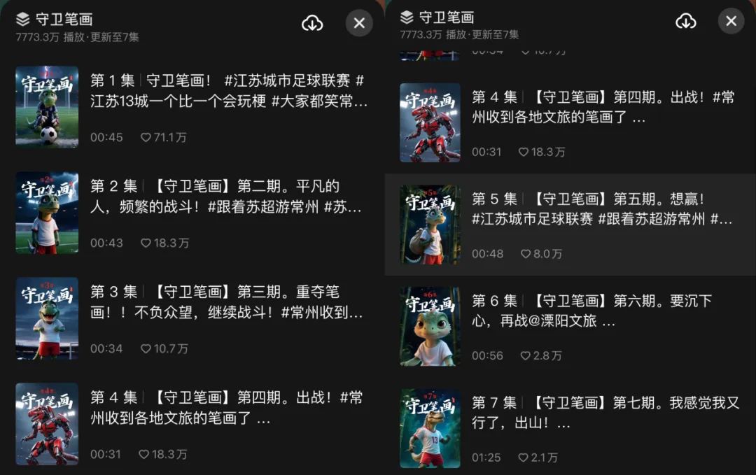 再来看@文旅常州 官方抖音账号,6月4日至7月1日共发布7集《守卫笔画》AI短剧,主要讲述了常州小恐龙如何不放弃,坚忍不拔寻找「熊猫」师傅学绝招的故事。同时,为比赛和常州特产「天目湖鱼头」都做了宣传。截至发稿前,7集AI短剧点赞量近150万。