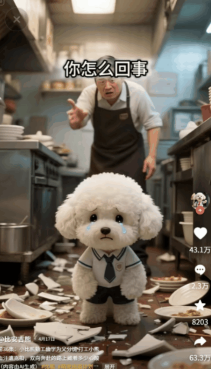 你一定在抖音上刷过类似的短视频——以猫猫狗狗为主角,借助AI技术实现拟人化演绎,剧情多融合复仇、职场等强冲突元素,比如「比熊打工赚学费」「橘猫手撕渣男」等。