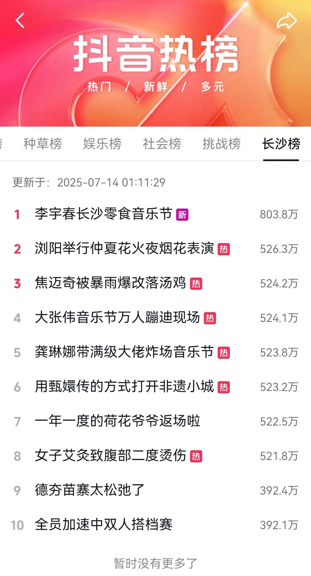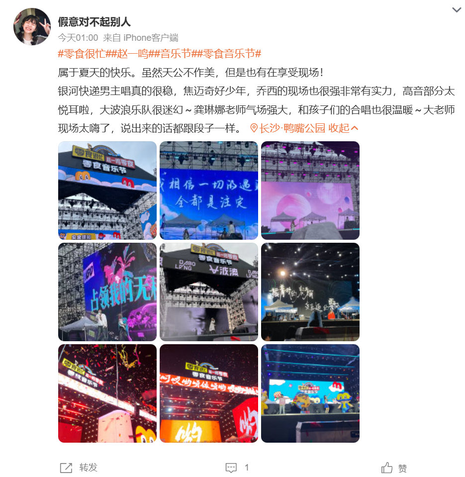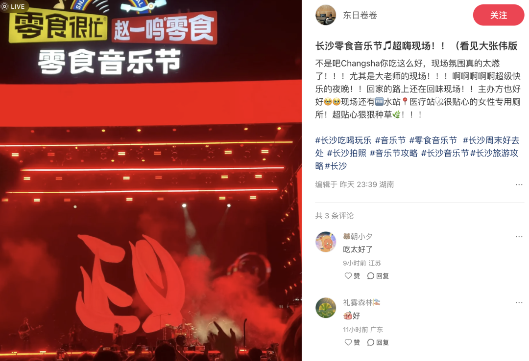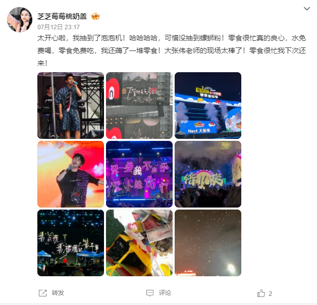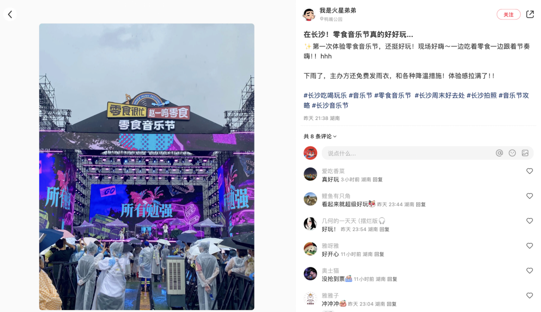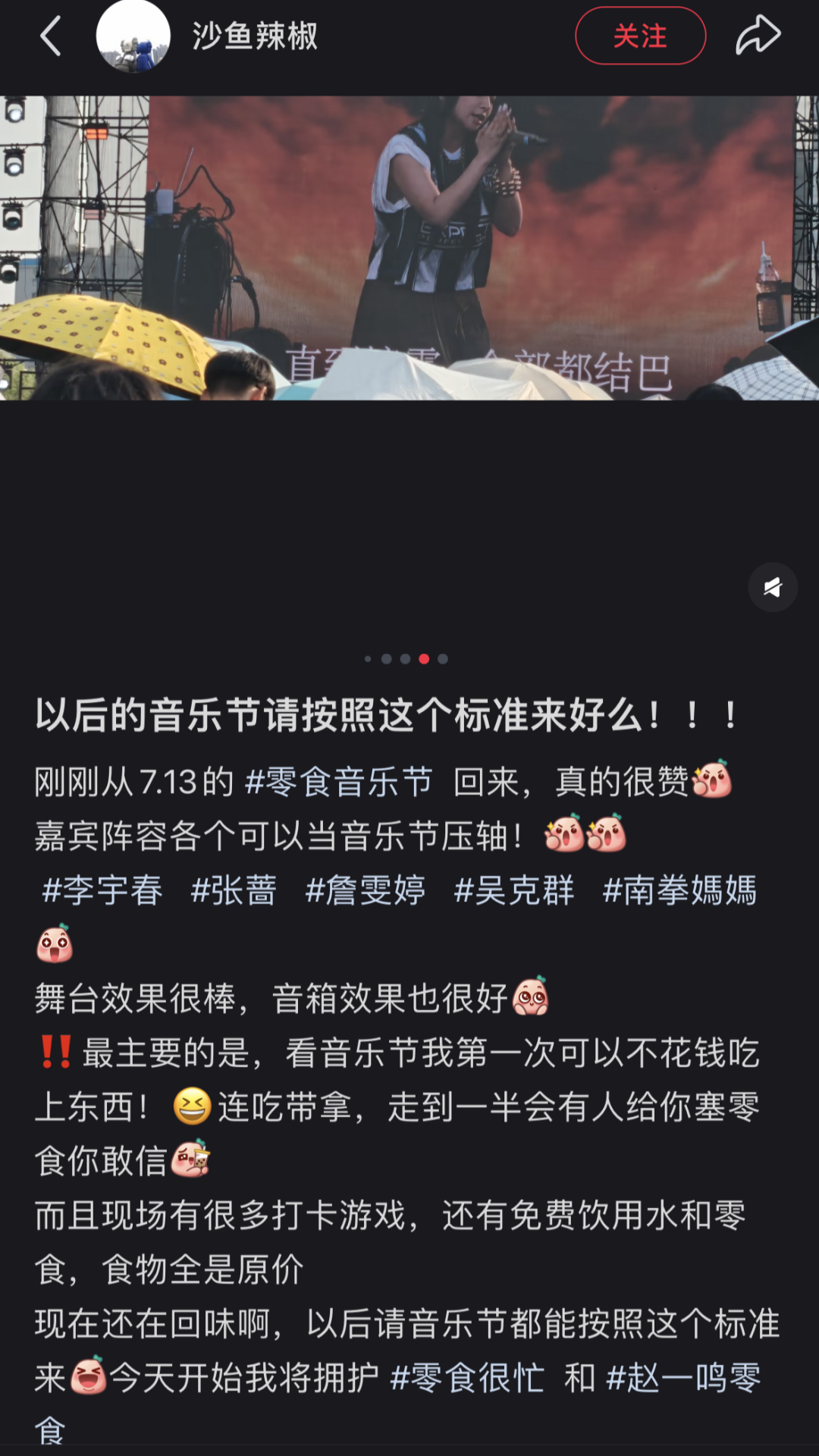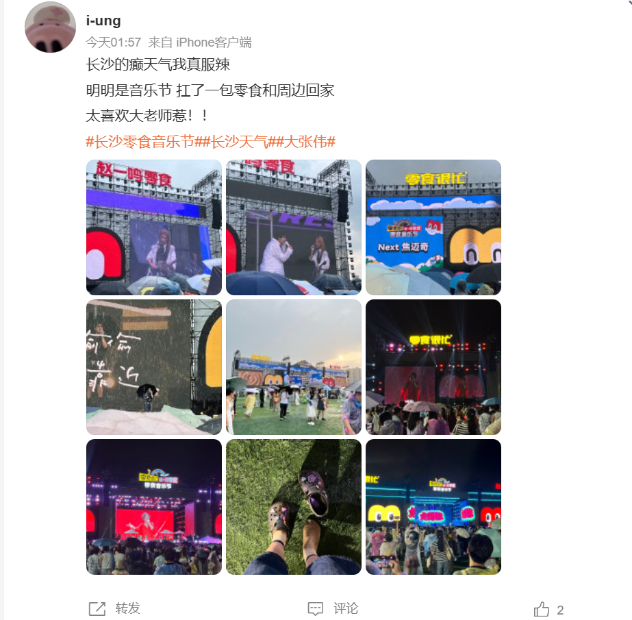 果不其然,在这场特别的零食音乐节开始之后,立刻以#李宇春长沙零食音乐节#焦迈奇被暴雨爆改落汤鸡#大张伟音乐节万人蹦迪现场#龚琳娜带满级大佬炸场音乐节#回春丹万人合唱鲜花等被大家所津津乐道的话题。
