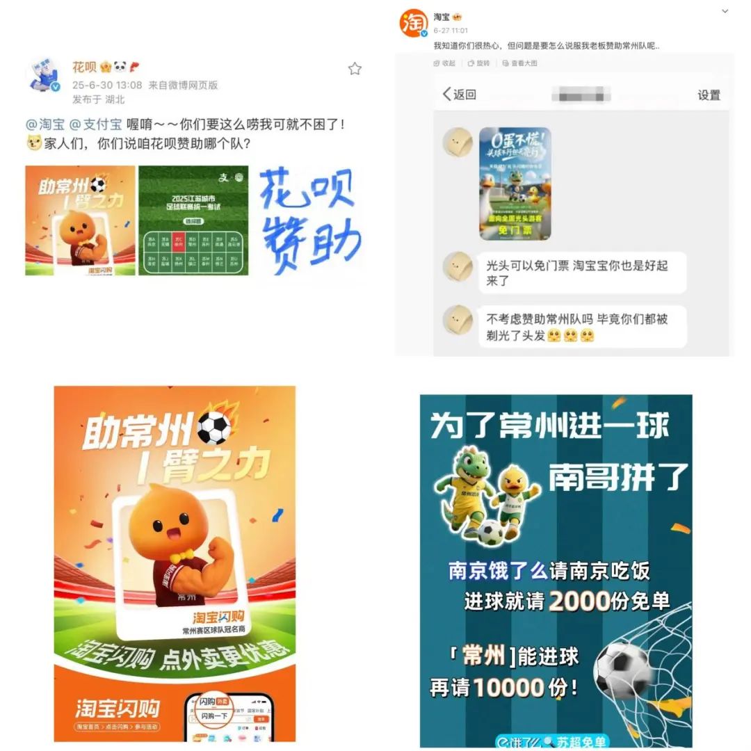 苏超赛事爆火时,阿里系品牌的 “散装赞助” 像一场夏日水枪战,热闹又解渴。淘宝盯着连输 5 场的常州队,说 “淘公仔是光头 IP,必须帮常州‘剃光头’翻盘”;支付宝瞅准人气最高的徐州队,喊出 “选 C 位,准没错”;花呗则借着 “无息” 谐音,硬是和无锡队锁了 CP。这些操作没做硬蹭热点的 “热辣营销”,反而像搭积木地把品牌特性(淘宝的 “薅羊毛”、支付宝的 “C 位野心”)和地域梗(常州 “送分”、徐州 “淮海省会”)拼在一起,让赞助变成网友能接梗的段子。然而,各个子品牌独立作战,缺乏阿里集团层面的统一叙事,可能让用户感知“品牌协同性弱”。