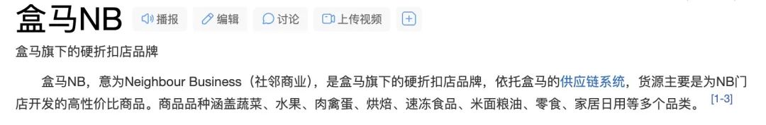 盒马NB是盒马在21年推出的硬折扣店品牌,NB不是“牛逼”的意思,而是“Neighbor Business”之意,通过直接与源头供应商合作的优势,以及商品差异化,来重塑社区消费格局。